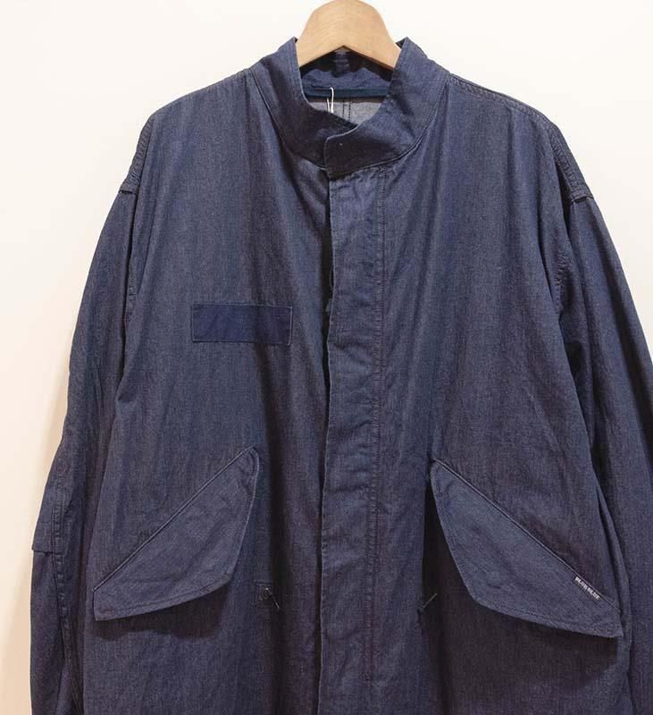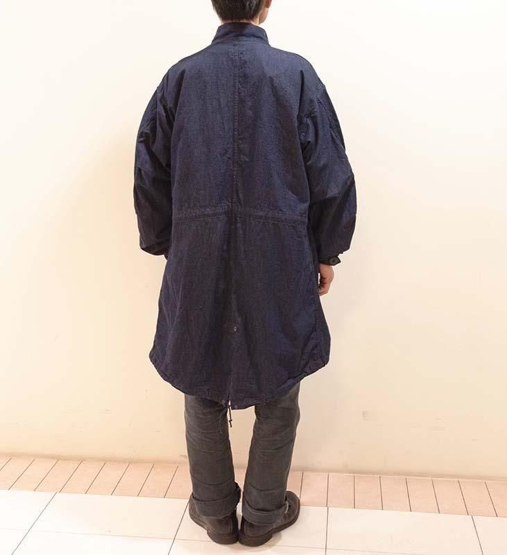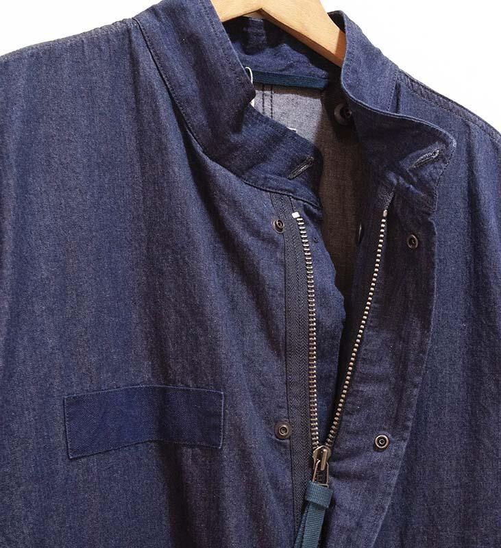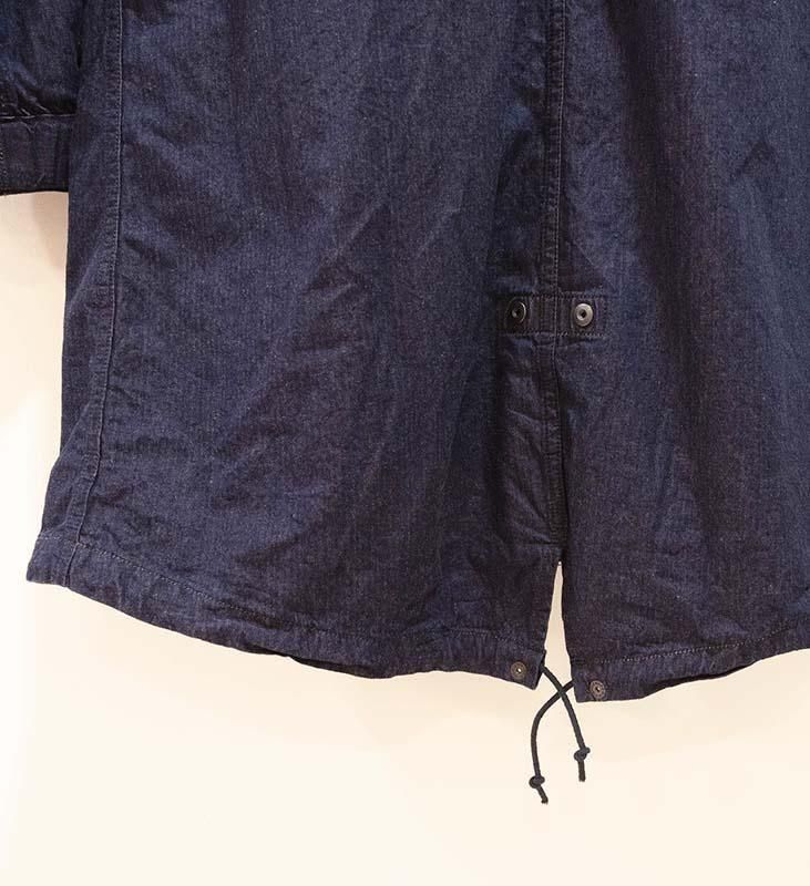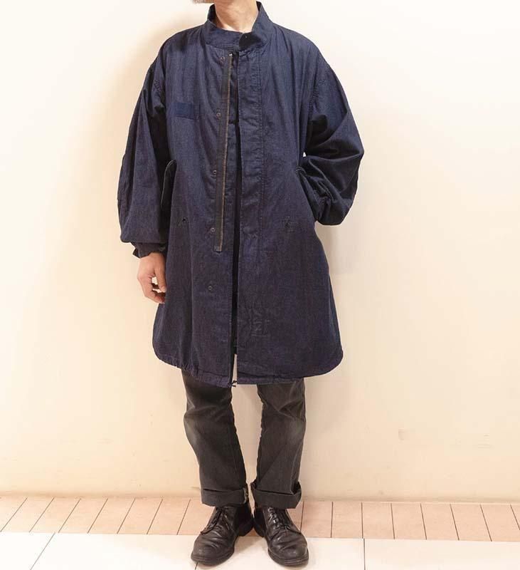 1960年代のアメリカ軍のフィッシュテールコートをモチーフに、アームホールやポケットの位置を使いやすく調整しました。実際にアメリカ軍が着用していたコートの、ボリューム感あるシルエットのイメージはそのままに、少しすっきりとさせることで現代的な印象になるよう仕上げています。素材をオリジナルデニムに置き換えることで、ミリタリーの雰囲気からガラッと落ち着いた印象に。インディゴ染めの胸元コットンテープなど、細部にもこだわっています。秋口にはライトアウターとして、寒い冬本番には別売りのGYMMASTER × BLUE BLUE フリースライナージャケットをライナーとして装着し、ヘビーアウターとしてご使用いただけます。