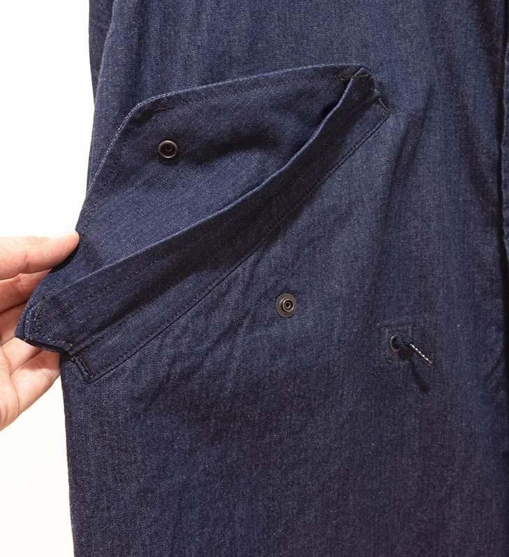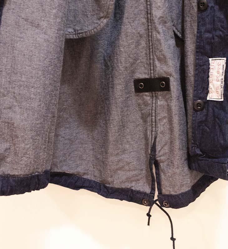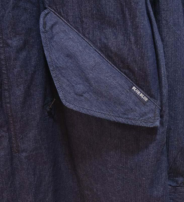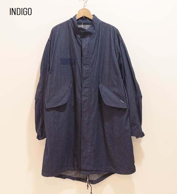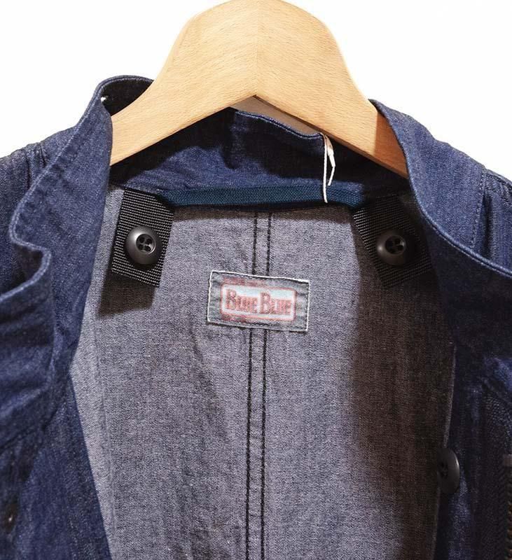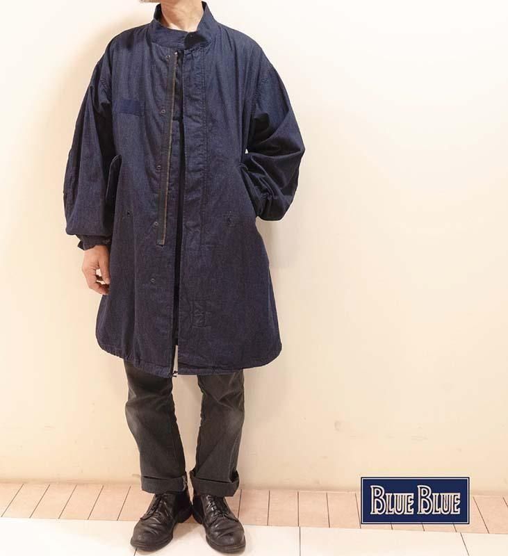 1960年代のアメリカ軍のフィッシュテールコートをモチーフに、アームホールやポケットの位置を使いやすく調整しました。実際にアメリカ軍が着用していたコートの、ボリューム感あるシルエットのイメージはそのままに、少しすっきりとさせることで現代的な印象になるよう仕上げています。素材をオリジナルデニムに置き換えることで、ミリタリーの雰囲気からガラッと落ち着いた印象に。インディゴ染めの胸元コットンテープなど、細部にもこだわっています。秋口にはライトアウターとして、寒い冬本番には別売りのGYMMASTER × BLUE BLUE フリースライナージャケットをライナーとして装着し、ヘビーアウターとしてご使用いただけます。